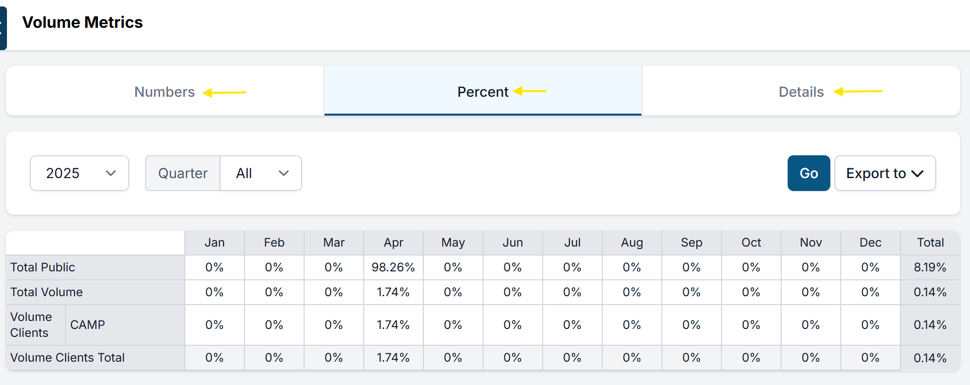 There are three tabs within Volume Client Metrics: Numbers, Percent, and Details. At the top of the page, you can filter for year, quarter, and location.
