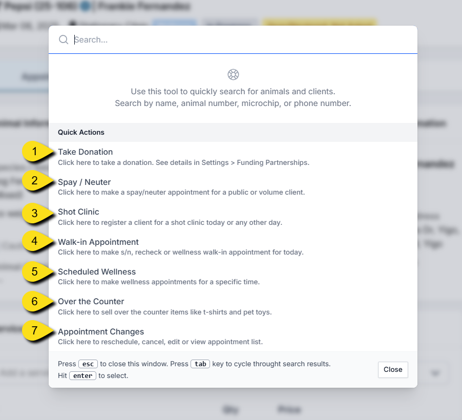On any given day, clinics may handle spay/neuter surgeries, routine wellness exams, walk-in vaccine clinics, or even clients purchasing items over the counter. The Action Menu helps guide staff to the correct workflow without guesswork.