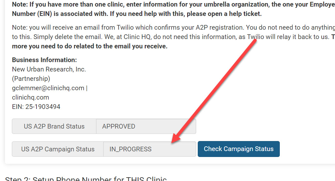 We will auto-register your "campaign." A campaign simply describes the nature of your text messages. By default, all clinics are registered a "business transactional." It should take about one minute for it to register the campaign. NOTE: Twilio has posted that due to the high demand, this process is taking longer than expected. Some users may not have an approved campaign for several weeks.