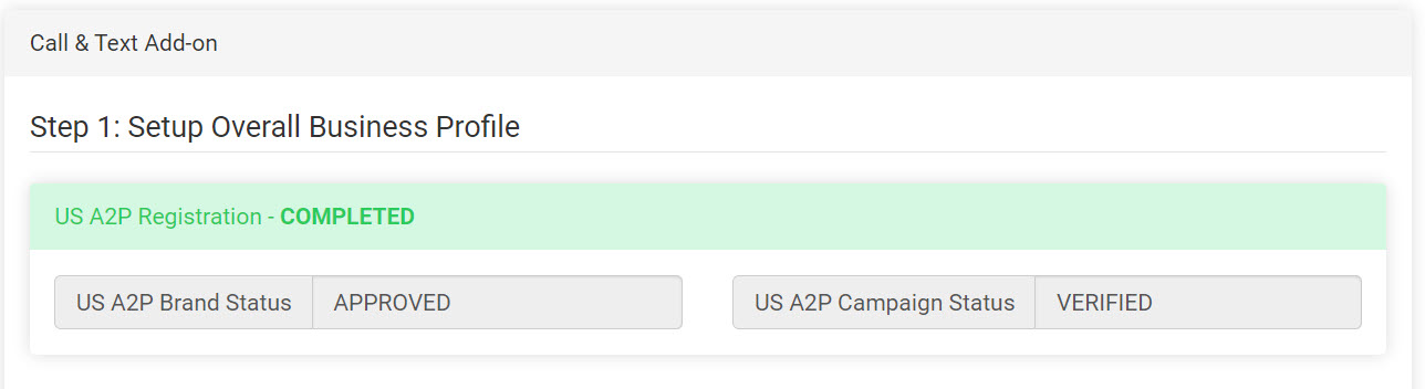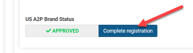 Once the US A2P Brand Status is "APPROVED," you must click the button beside the status and submit the campaign, by clicking Complete Registration.