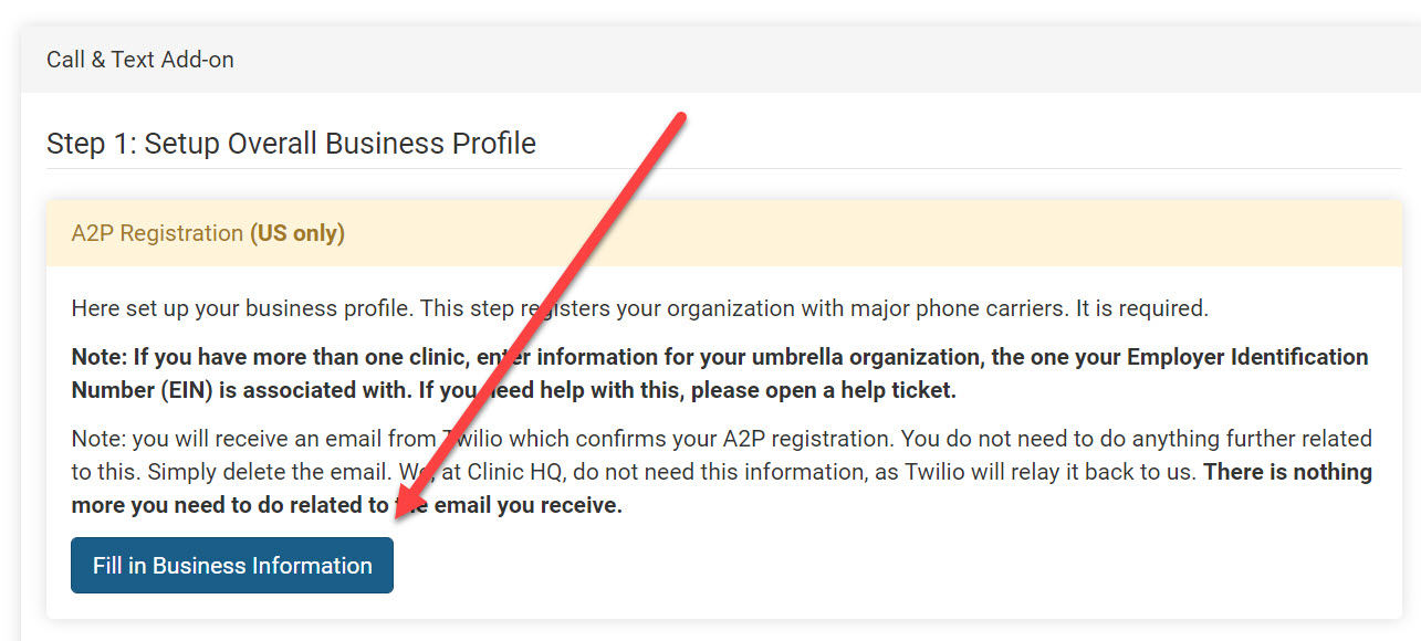 Please go to Settings > Call & Text Add On and click the button to “Fill in Business Information.”