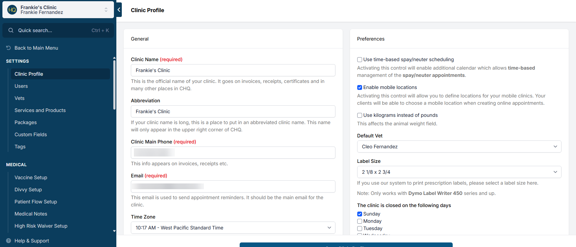 The General section of the clinic profile houses your clinic’s core information, such as the clinic name and contact details. Each field below impacts how information appears throughout the system.