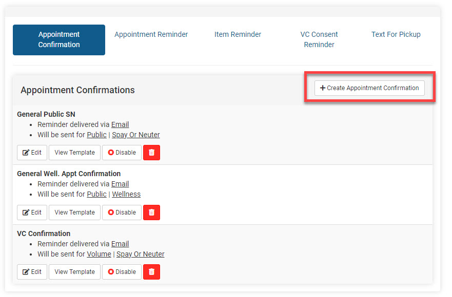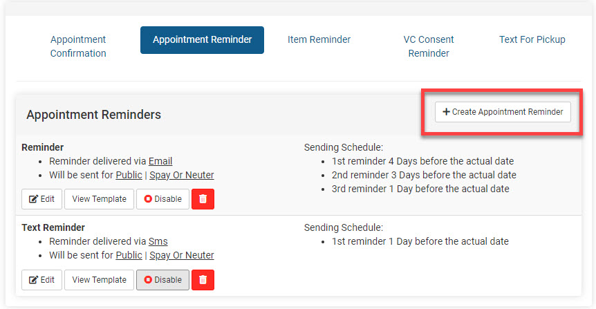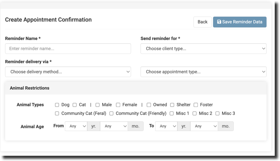 These communications are sent out when an appointment is created/confirmed. After clicking +Create Appointment Confirmation, a window pops up where you can provide relevant details like a Reminder Name. You can easily separate reminders by animal type and animal age.