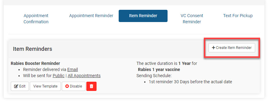 Item reminders can be used in many ways to send emails or texts to the clients post visit. Item reminders can be used to send surgery follow up, vaccine booster reminders, preventative purchase refill reminders and more! An item reminder utilizes the services/products on an animal's appointment. Only if that item was on the checked out appointment will the client receive a communication.