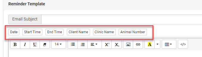When creating the email/text/robo call message, utilize the fields within the setup to populate the real information about the client, animal, or date. Remember that if the reminder is a text, the character length will change based on the actual animal name or date populated. Tip - stay under the 160 count when using the fields in the text setup.