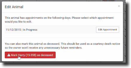 Let's say an owner calls and lets you know that she received a reminder for an animal that passed away. The client can either opt-out of future emails via an opt-out link or you can mark the animal as deceased in HQ, and they will no longer receive reminders.
