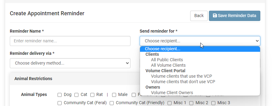 Understanding the "Send reminder for" options:Public Clients - the individual person/pet owner the appointment is scheduled under. Volume Clients - the organization the appointment is scheduled under VCs that use the VCP - organizations that use the Portal. They may be reminded to enter animal details in their Portal. VCs that do not use the VCP - organizations that do not use the Portal this may be groups such as your own internal shelter animals or trappers. They would not be reminded to enter animal details through the Portal. Volume Client Owners - the VCO is the owner listed on an animal's appointment under the Owner section. A VCO is not the same as the VC.