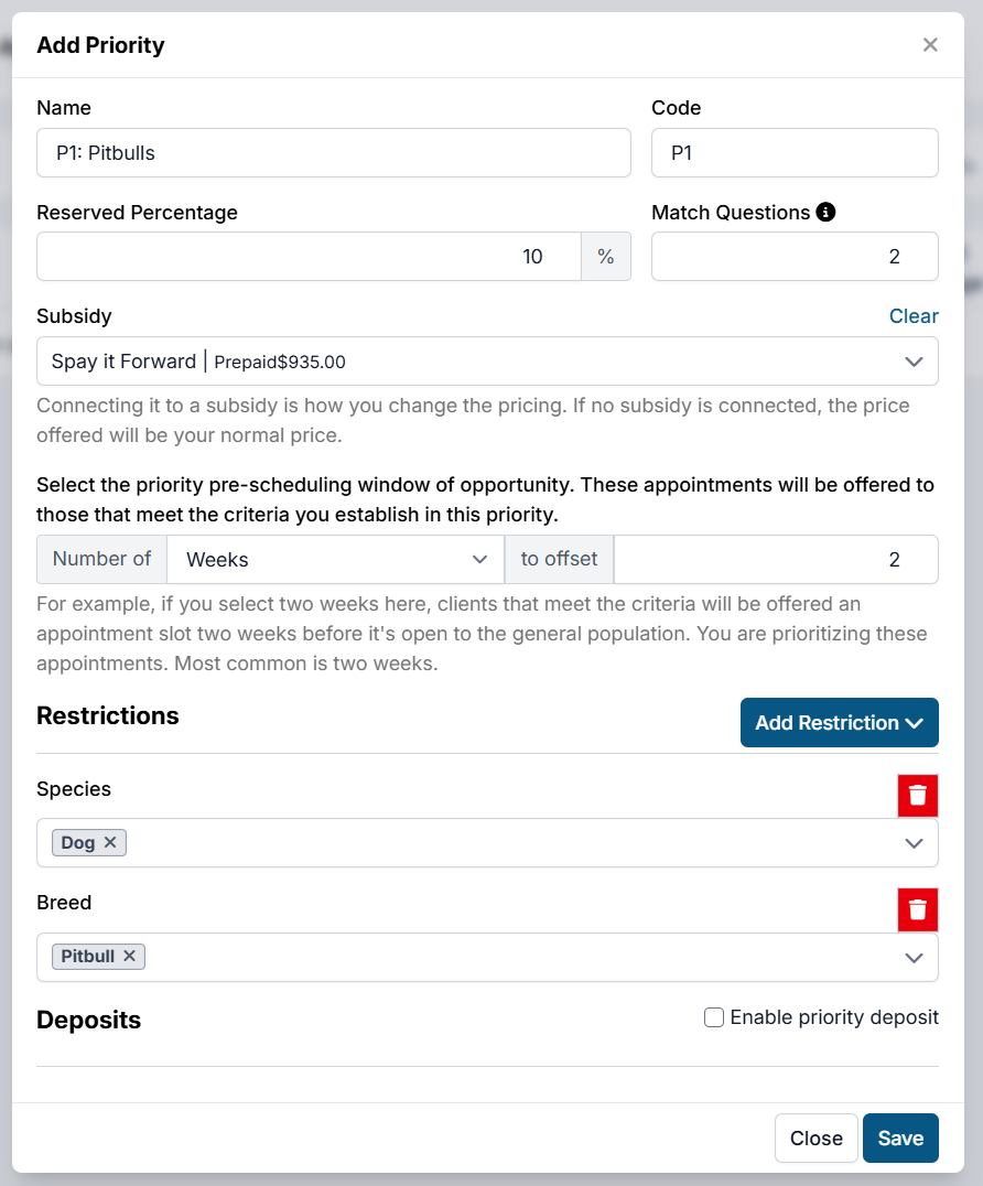Decide if you want clients who qualify for priority scheduling to pay a deposit when booking their appointment. If a subsidy is applied, the deposit amount and overall price will be adjusted accordingly.