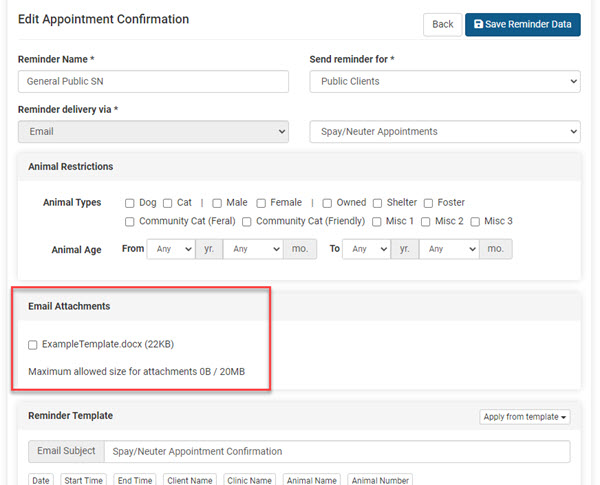 Email attachments include any attachments that you might want to send with your confirmations or reminder emails. A document/PDF such as “What to expect after your pet’s surgery” or a flyer for an upcoming event.