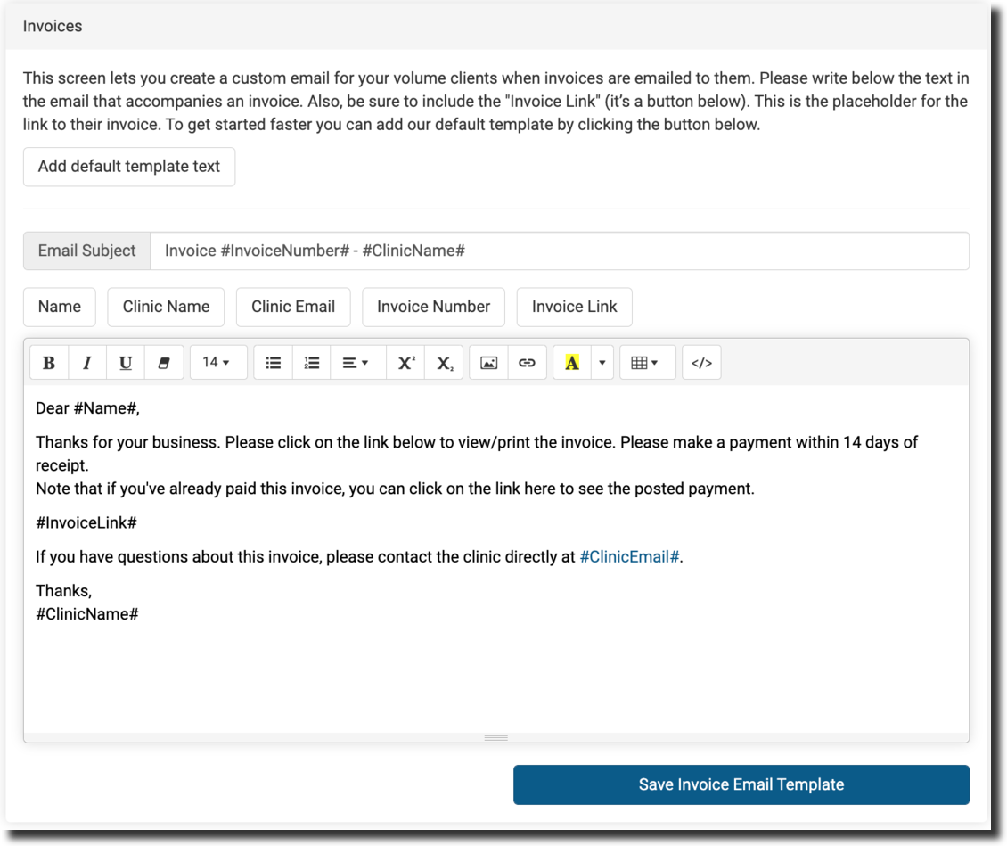 Invoices under Communications settings, is where you can create a custom email for your volume clients when invoices are emailed to them. You will write in the box the text in the email that accompanies an invoice. To get started faster, you can add our default template by clicking the button.