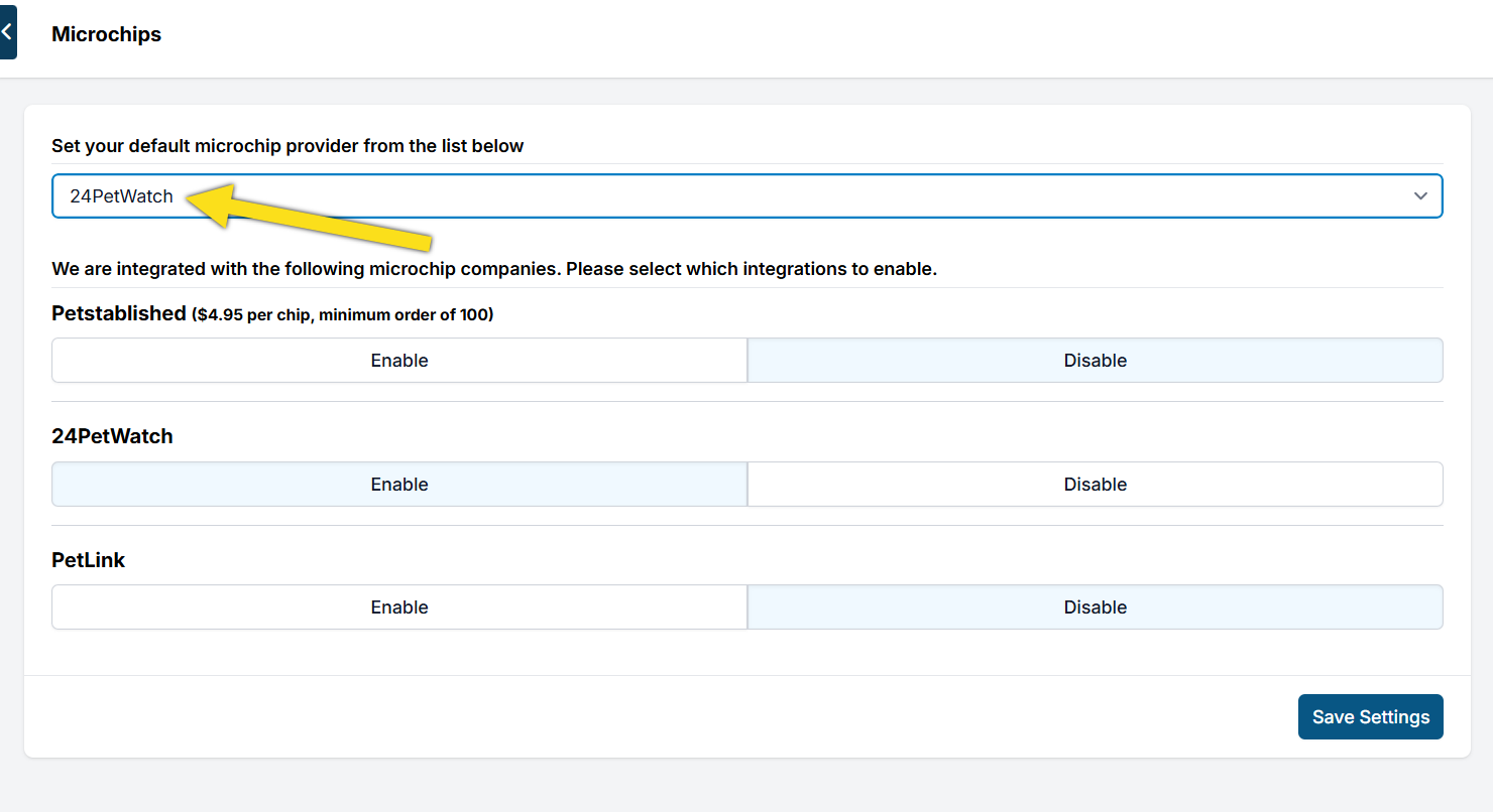 Microchips are an essential part of patient records in HQ. While your clinic can use any microchip brand, HQ offers several integrated partners that provide added benefits, including automatic registration and access to discounted chips. This section of settings is where you link your clinic to our integrated partners and set your default chip provider.