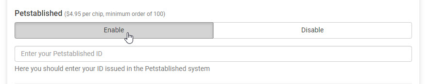 If you enable the integration, you will need your Petstablished ID#. This is provided by Petstablished when you begin ordering chips.