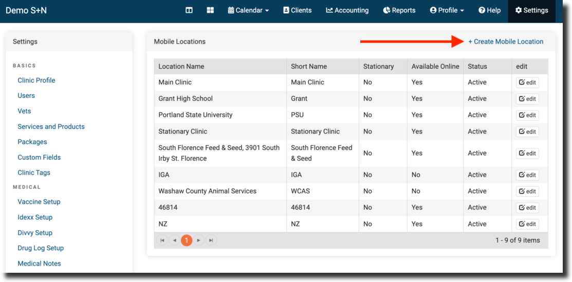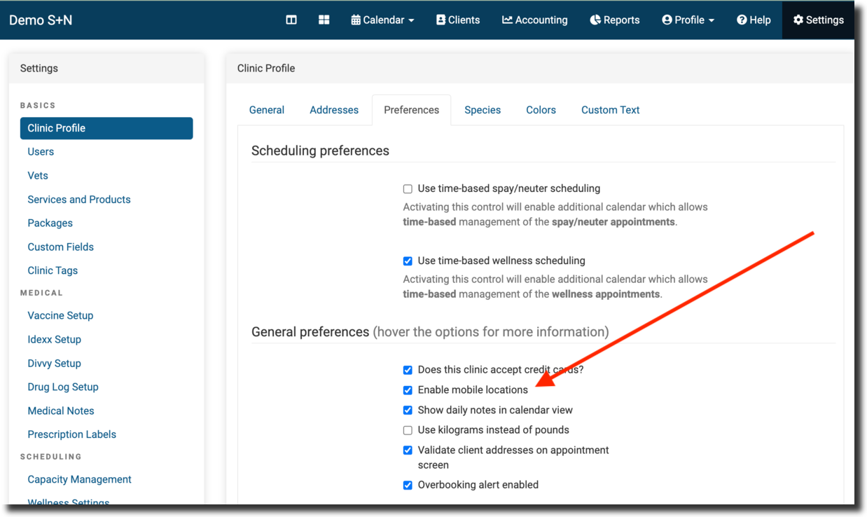 Ensure you have mobile locations enabled in Settings > Clinic Profile > Preferences. Click Save at the bottom. This will add a Mobile Locations page in Settings under Scheduling.