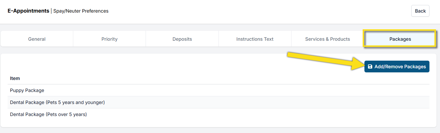 Under the tab Packages, use the Add/Remove Package button to toggle packages on/off for that E-appointment type.