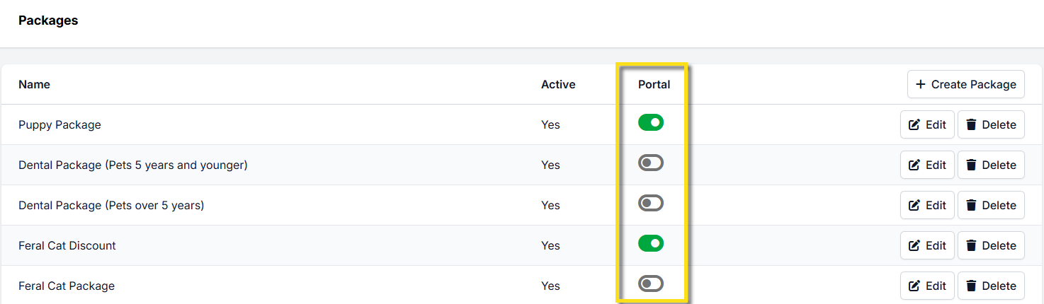 In Settings > Packages use the toggle under the Portal column on the packages list.