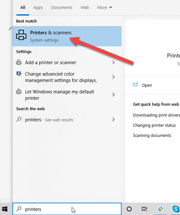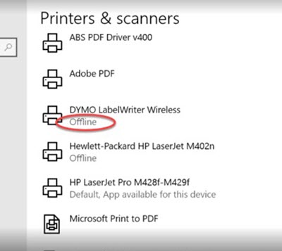 !TIP Tip for #1 and #2, on the Windows icon type the word "printer" and select Printers and scanners. Then look at the Dymo Printer status for if it is offline or not. Monitor this section when trying to power on the printer or change ports.