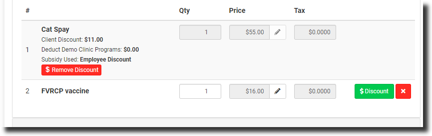 - On this tab, the only column we will use is the client discount. In this column, you can put the amount to discount on the public price. Example: Cat Spay is $55. Your employee discount is 20% off. The client discount amount will be $11. Pot Deduct remains at 0, and the new services price remains 0.
