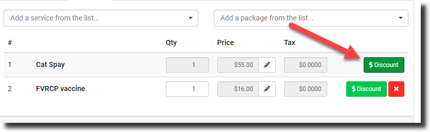Edit the services, and next to the service item is a green Discount button. Click this and choose to apply the appropriate discount. You can apply different discounts to the list of services in order to reach the correct final price. For instance, you can apply a $5 copay to the rabies service and a $10 copay to the surgery service, so that the owner owes a total of $15. The discounts apply to individual items.