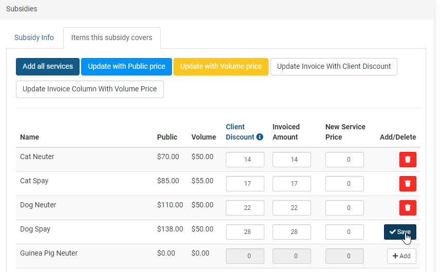 The column for Client Discount will match the title of the subsidy. You will likely need to calculate the discount amount for each subsidy you set up. The client discount is the amount to subtract from the item's regular price. Example: Cat Spay is $85. Your subsidy discount is 20% off. The client discount amount will be $17.