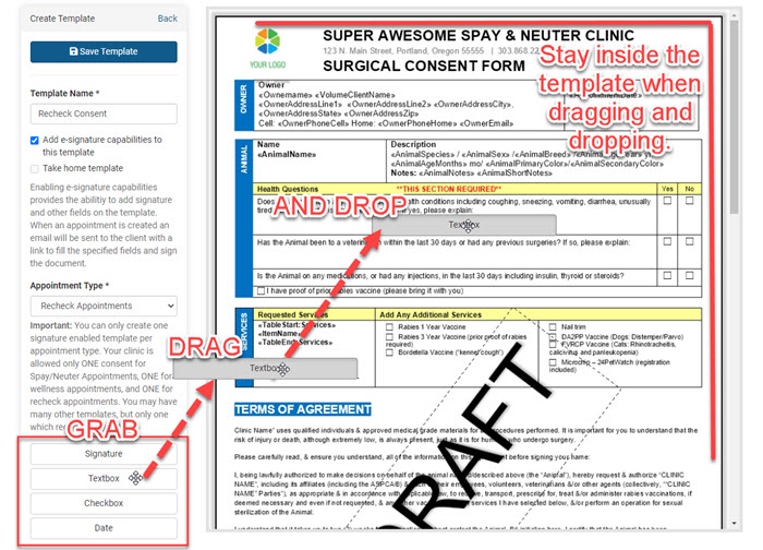 Upload your clinic’s High Risk Waiver. Be sure to tag it as a High Risk Waiver. Then, drag the signature and date fields onto the template for where the client should sign electronically.