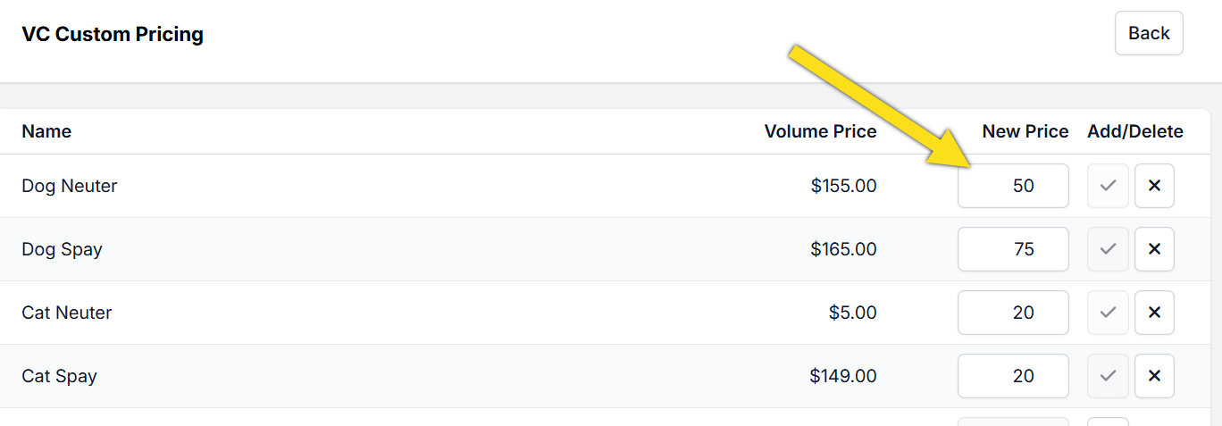 This section lets you set a specific price for an item or service for an individual volume client. Any price entered here will override all other pricing configured in Settings, including: