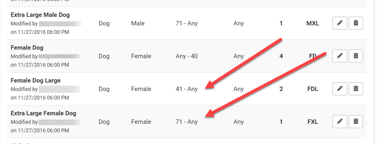 - Overlapping weight ranges – Ranges must not overlap. Example: ** Correct: Female dogs 2–20 lbs, next range starts at 21 lbs ** Incorrect: 2–20 lbs followed by 20–40 lbs (animals at 20 lbs appear in both tiles).