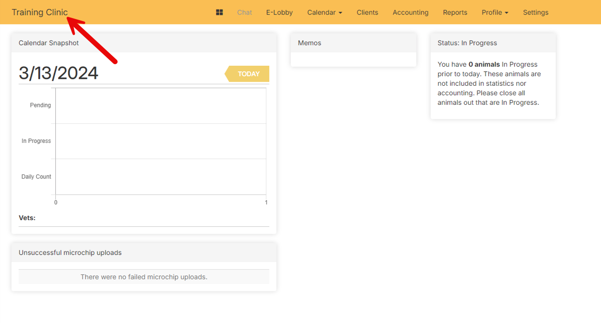 - The name Training Clinic appears in the upper-left corner instead of your clinic’s name.