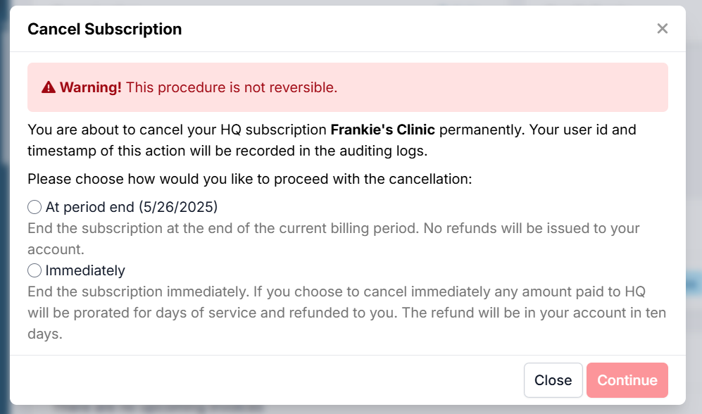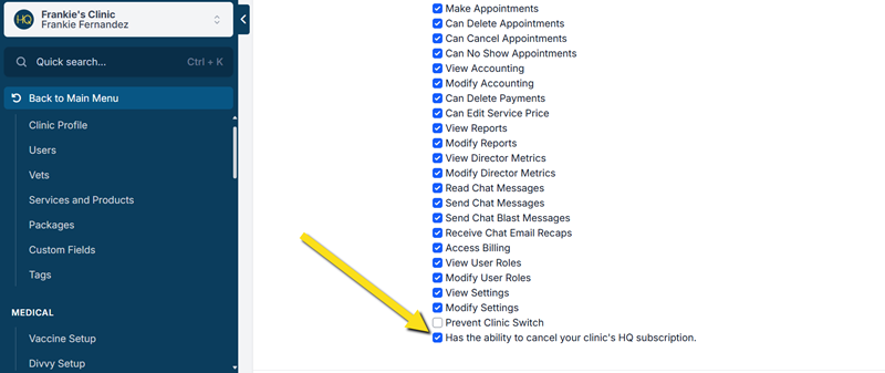 You can now cancel your own HQ account. To do so, you must have the user permission set under Settings > Users > Roles > Edit (Role) > Has the ability to cancel your clinic's HQ subscription. We recommend very few users have permissions set to cancel your subscription. If you modify this permission, you need to log out and back in for it to take effect.