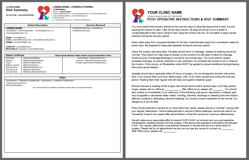- Other merge fields based on your clinic’s preference, including options such as Exam, Surgery Summary, prescriptions, and drugs used.