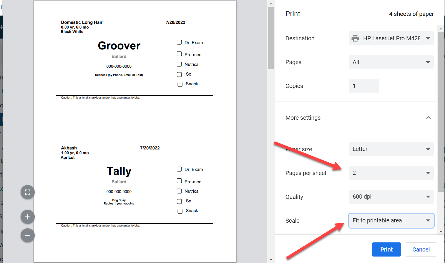 To ensure cage cards are useful and don’t block the view of the animal, print them at a smaller size. We recommend printing two cards per sheet and setting the scale to “fit to printable area.”