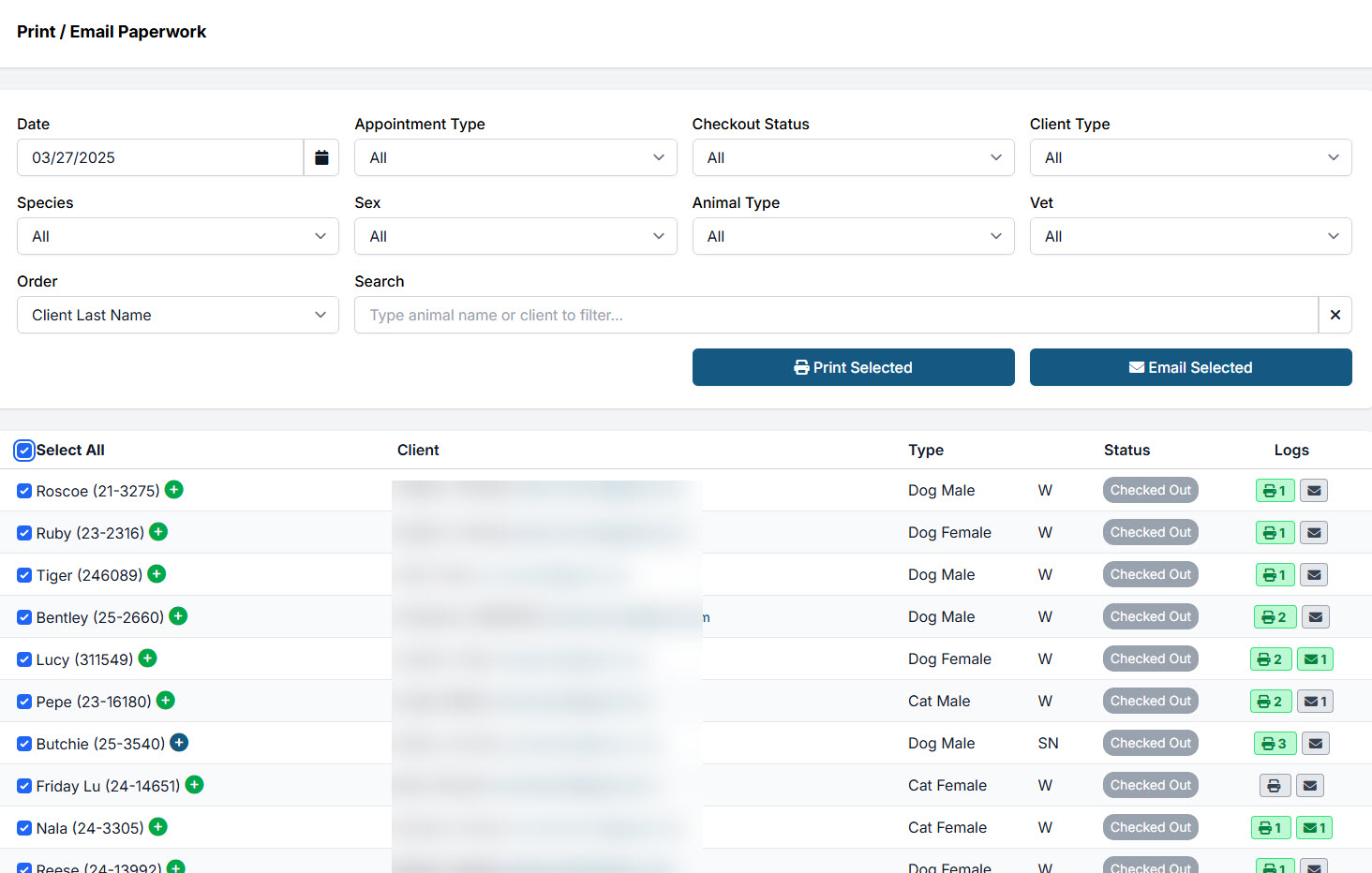 - Go to Clients > Check In/Out > Print/Email Paperwork.