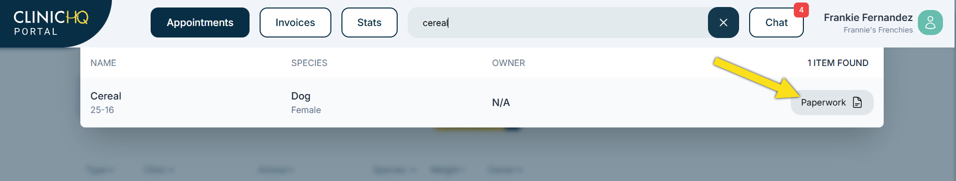 - Use the search bar to look up the animal by name, animal ID, or other identifier. Click Paperwork.