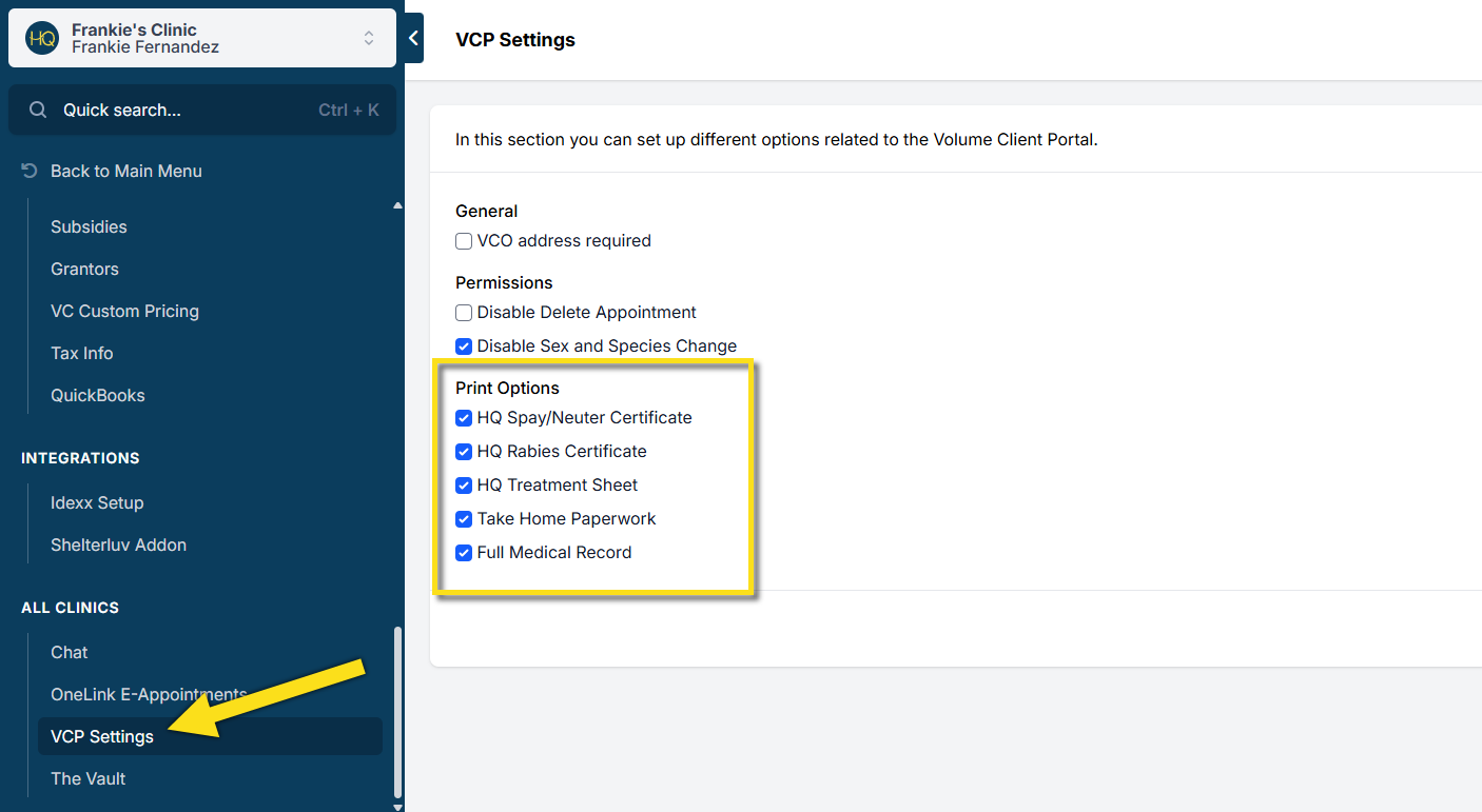 - Only paperwork options enabled in the clinic’s VCP Settings will be available for clients to access.