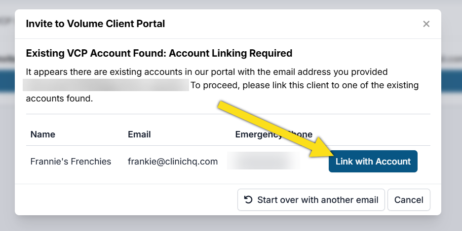 - If the email matches an existing Portal account, a prompt will appear to link the account to your clinic.