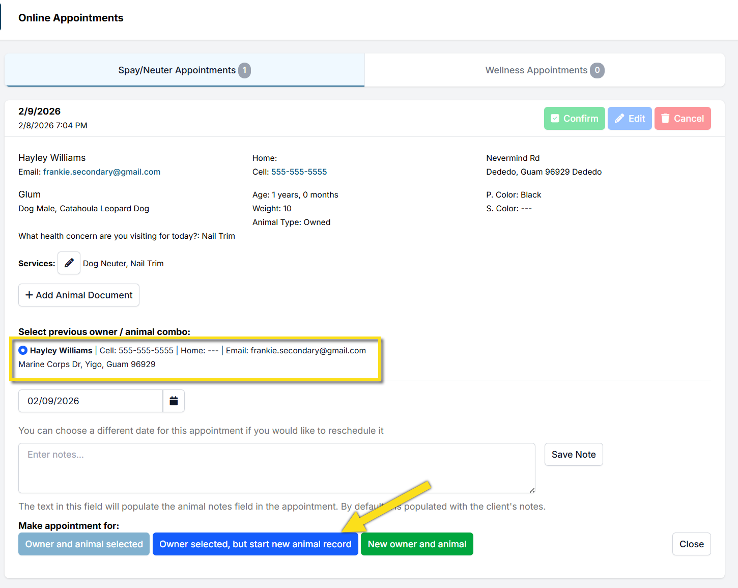 - If the client or animal has visited your clinic previously, select the existing owner and animal record when prompted.