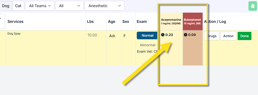 Once the weight and the maturity of the patient are put in, pre-medication doses are auto-populated in HQ. The drug drawer (either the veterinarian or a licensed vet tech) will then draw the appropriate premedication drugs into a syringe, place a fresh needle onto the syringe and pass the syringe of premedication off to the veterinarian. The veterinarian will then give the premedication intramuscularly to the canine patient. If your clinic is not entirely paperless, a scribe may mark the time and amounts of which drugs were given on the physical treatment sheet.