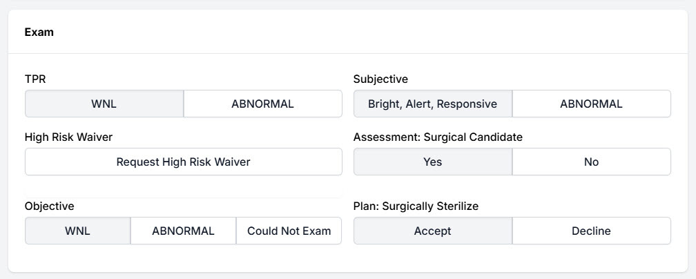 - Objective: If the exam was not normal or If a full exam could not be completed, you can mark Could Not Exam. The options Loud Purring, Could Not Handle, and Other can be selected.