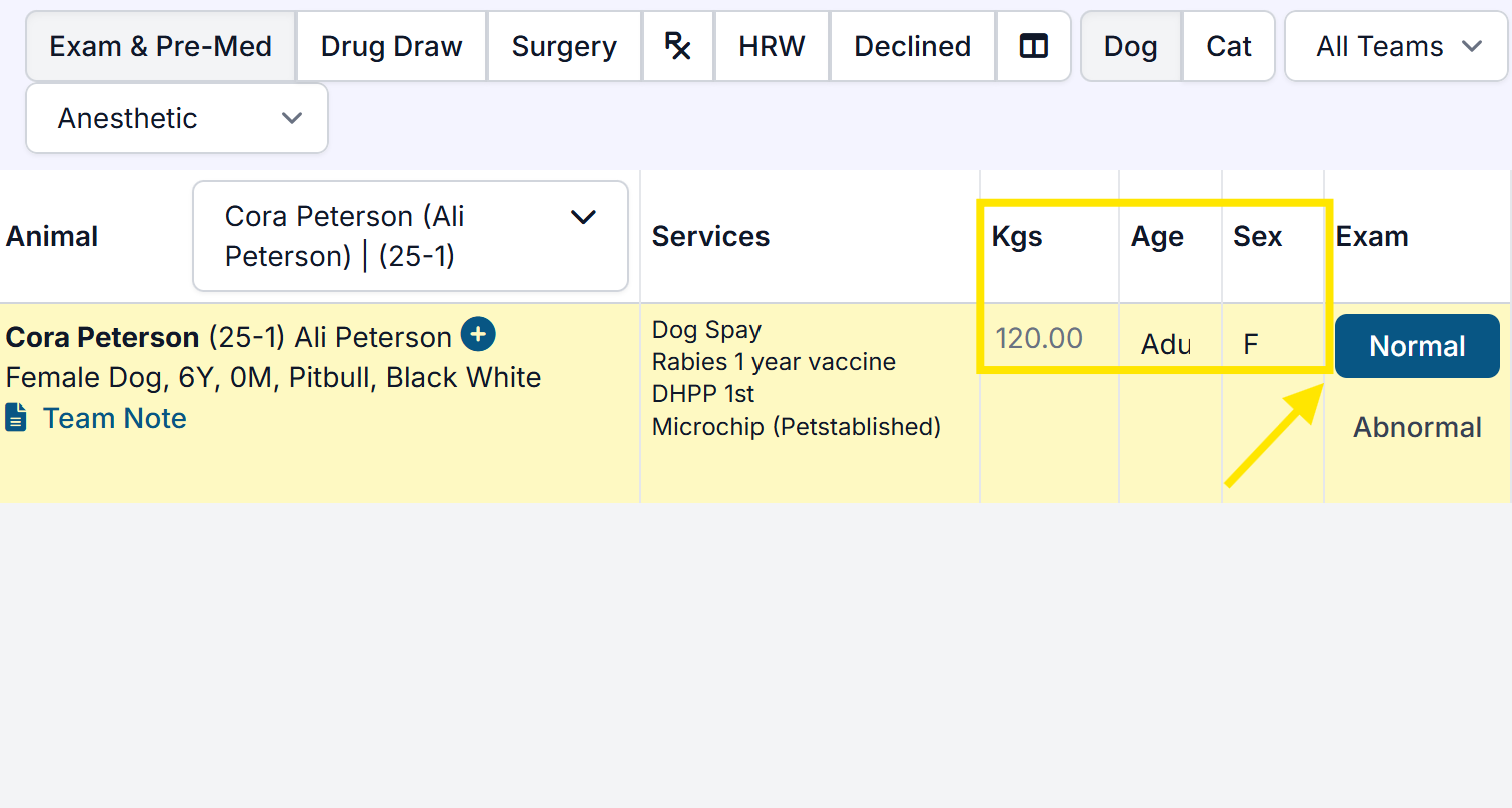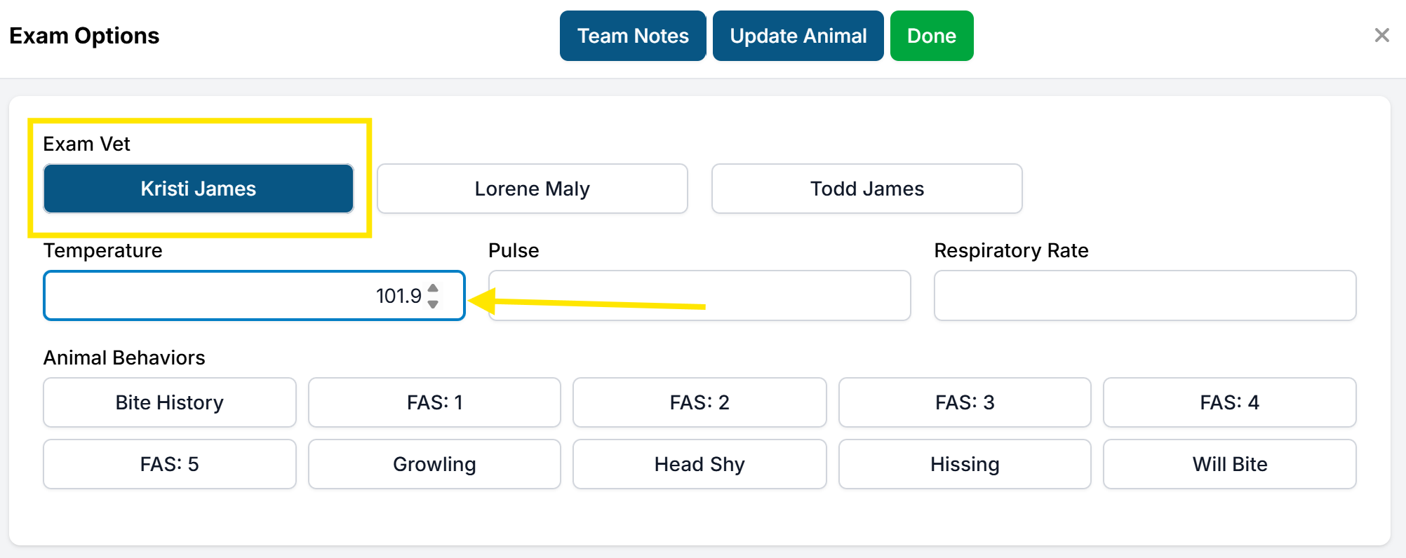 - To record the patient's TPR, click the Normal button under the Exam column. Enter the exam veterinarian, the vitals, and any findings. Click Done to save.