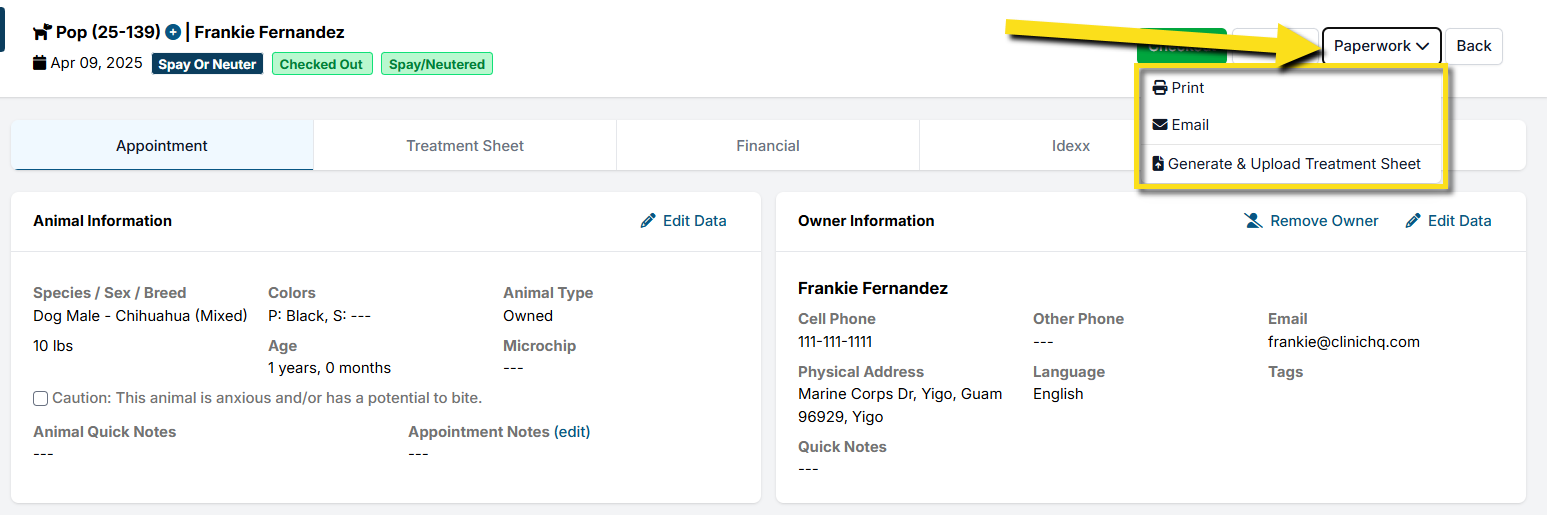 To print or email an animal’s paperwork from Patient Flow, you will move the animal all the way through Patient Flow, and on the final page, you will see an option up top to print or email their paperwork. This can be done for an anesthetic or non-anesthetic appointment. If it is a non-anesthetic appointment, you can just click Jump to Finalize.
