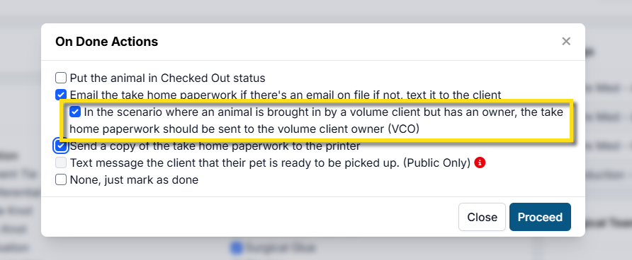 If your clinic has patient flow automations set up, you can select the take home paperwork to be sent to the VCO.