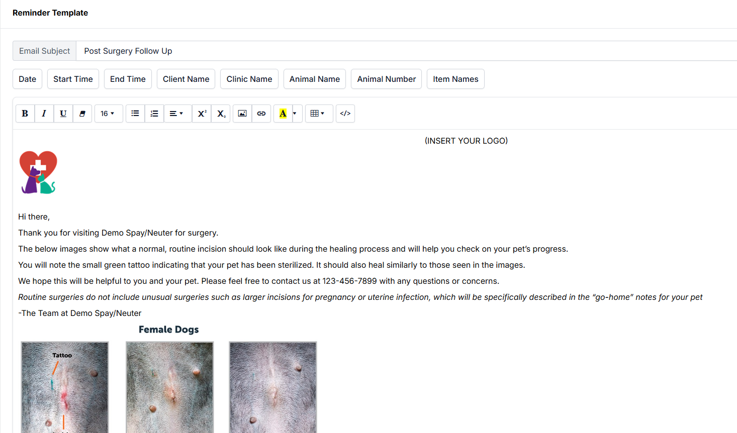 - Reminder Template: Create the email message. Click the field buttons to insert the hashtag fields. These will populate with appointment details. This message is completely up to your clinic but feel free to copy the message from the Healing Email download! This is just a sample! Be sure to include what the client/owner should do if there is a concern.