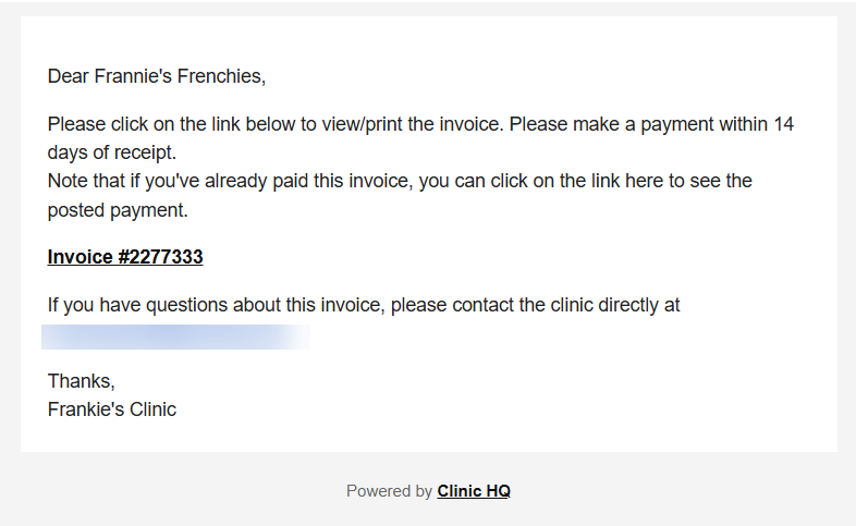 The volume client will receive an email containing the invoice. This can be paid through their Volume Client Portal (VCP) or your clinic can apply payment internally.