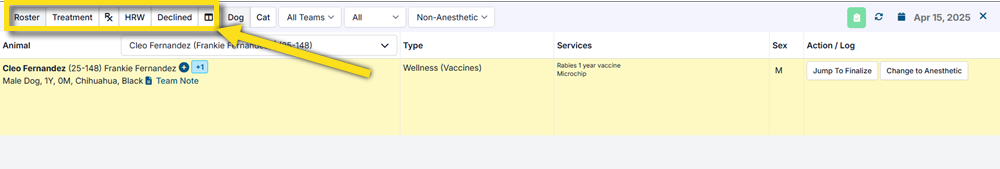 - The Roster tab is where you review the animal notes, services, and gather supplies for the treatment.