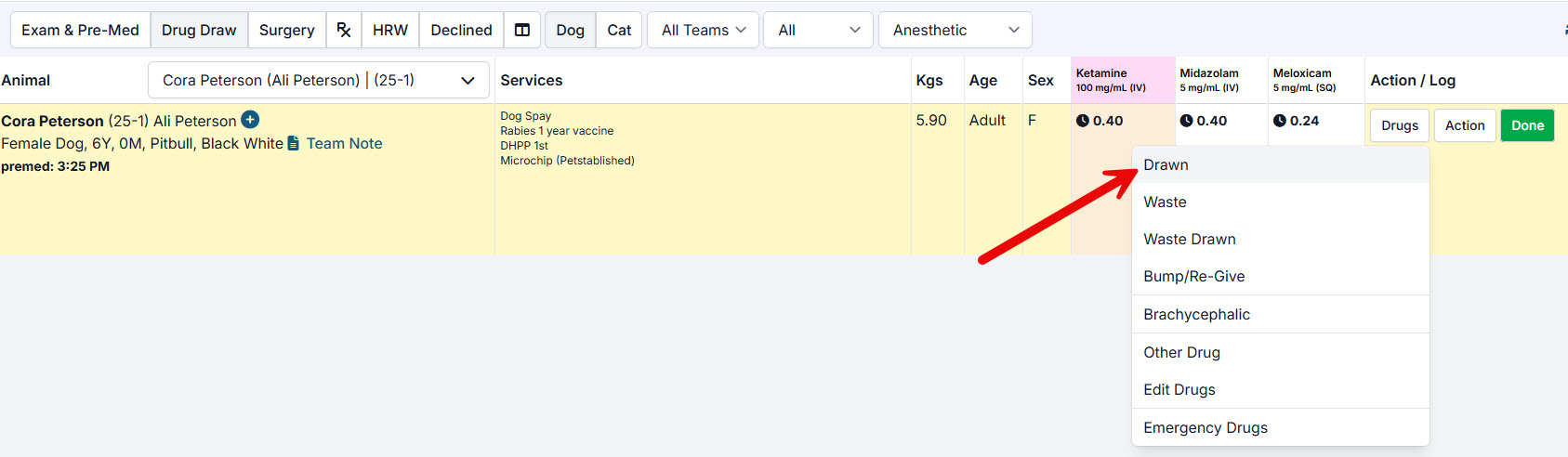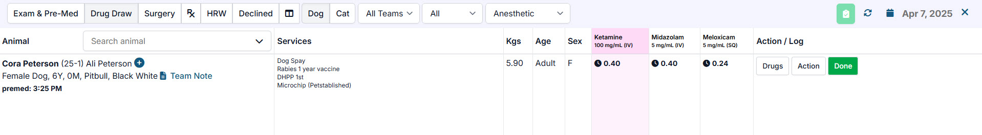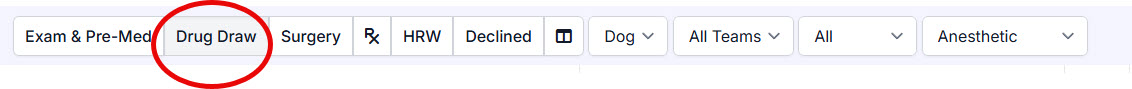 Once the patient is marked "Done" from the Exam & Pre-Med screen, they are pushed over to the Drug Draw tab in Patient Flow. This flow means that your drug drawer can begin pulling up induction drugs in concert with the exams being done. What a win! This means you don't have to wait until all the exams are done to start drawing up drugs. You can simply begin to pull them up once they've been cleared for surgery.