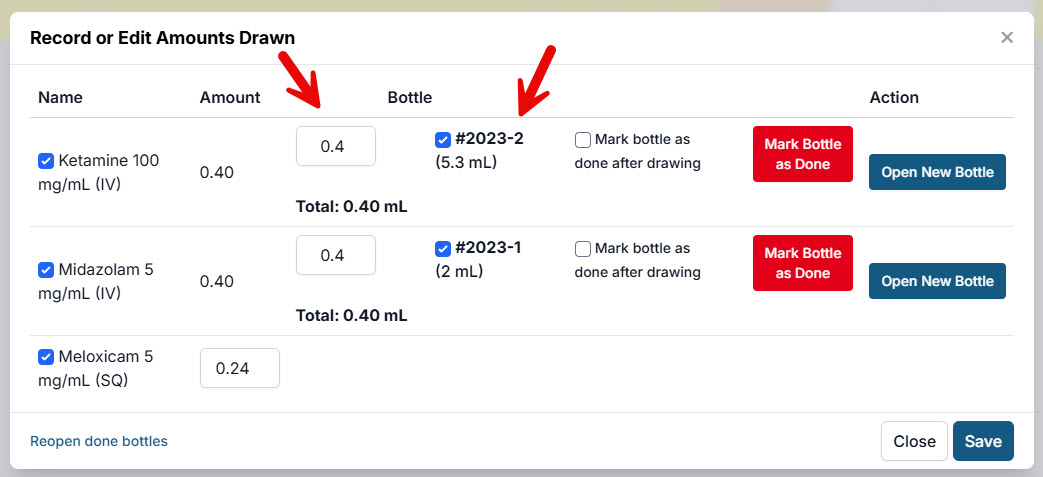 - Look at the bottle number to make sure you are drawing from the bottle indicated on the computer screen. You will note the dose amount and make sure that's what you've drawn. Then you will click Save. This will save the information to the drug log. It will draw down from the original totals you started your day from.