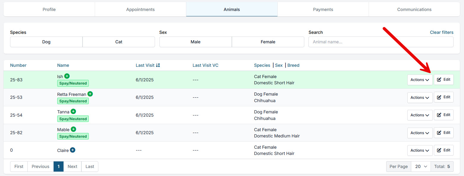 - Go to the Animals tab and click the Edit button for the patient, click Edit Appointment button again.