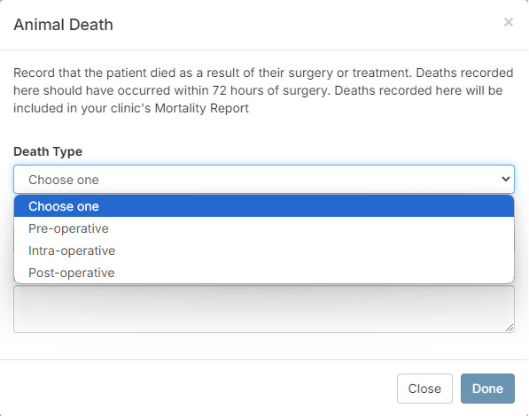 Please Note: Deaths that are recorded in this manner should have occurred within 72 hours of surgery, and these deaths will be recorded in your clinic's Mortality Rate.