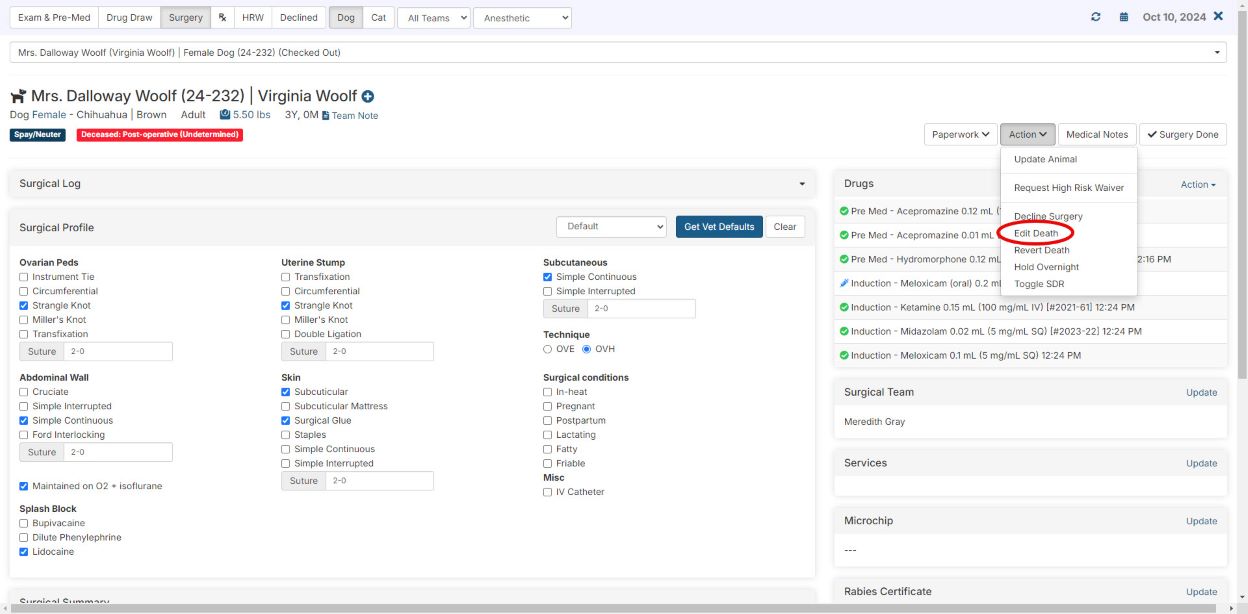 - We realize that a necropsy can take some time, so there is an option to Edit Death in Patient Flow. To edit the Death Cause once the necropsy results have been returned, go to Patient Flow, change the date to the animal's appointment date, go to the Surgery Tab, and click on Action > Edit Death.