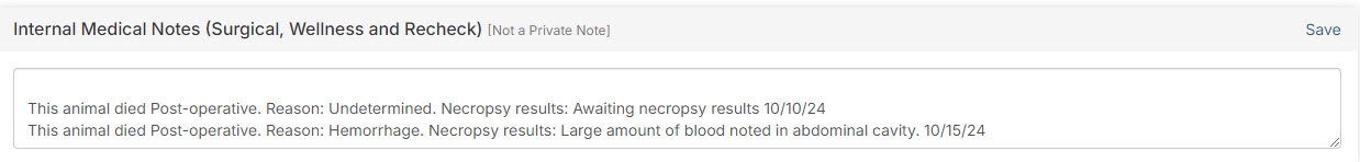 - If your clinic or an owner decides to have a necropsy performed, you can enter the results under Necropsy Result.