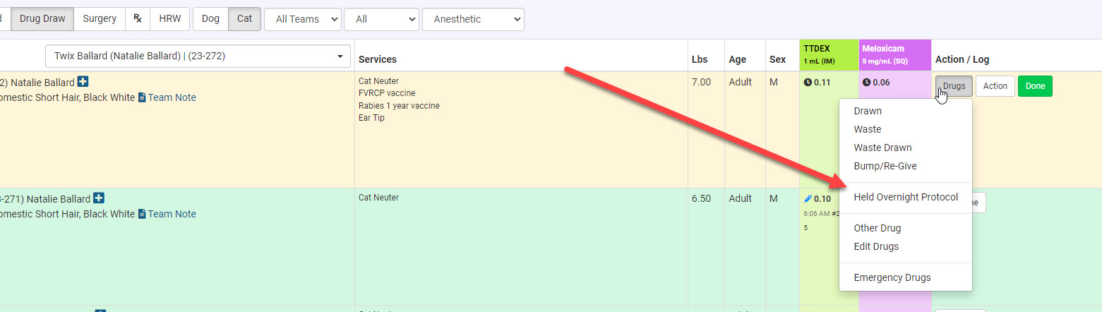 #_ On the Drug Draw phase of Patient Flow, click Drugs > Held Overnight as the non-standard protocol from the Drugs dropdown.